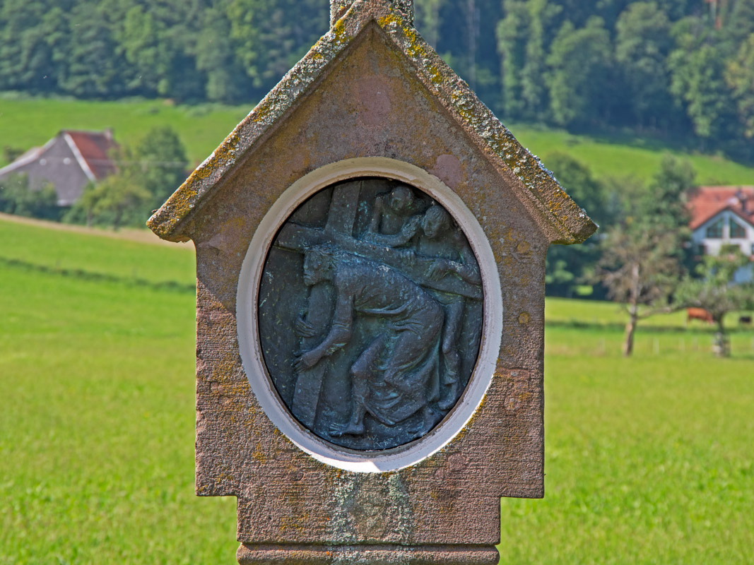 Der Hitzenhofbauer Josef Ernst gestattete „für alle Zeiten“ den Zugang zu den Stationsbildern bis hinauf zum Steinkreuz. „Die 14 steinernen Bildstöcke schuf der Steinmetz Florian Hügel aus Krozingen“. Die Stationsbilder stammten aus dem Rhonetal.