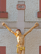 Das einfache, sehr hohe Kreuz trägt einen ausdrucksstarker Korpus mit goldenem Lendentuch und eine verzierte INRI-Tafel. Am Kreuzstamm ist das Datum 1688 eingraviert.