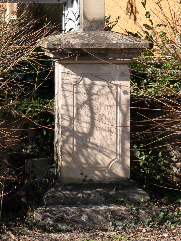 Auf der dem Friedhof zugewandten Seite trägt der quaderförmige Sockel ein Inschriftenfeld. Eingraviert ist der Vers 18 aus 1. Korinther, Kapitel 1, sowie die Jahreszahl 1927: