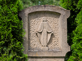 Vor dem grob gerauten Hintergrund der Nische, diese mit leicht gerundetem Dach, steht das Relief einer Frauenfigur. Mit ihrem aufgehaltenen Umhang, ihren einladend geöffneten Händen erinnert die Figur an den Typus einer Schutzmantelmadonna.