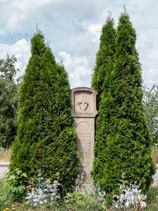 Auf einem Rechteckspfeiler des 170 cm hohen Bildstocks sitzt ein kleiner Tabernakel-Aufsatz mit Nische, seine Schauseite weißt zum Fahrradweg hin. Auf dem Pfeiler ist ein gerahmtes Inschriftenfeld zu sehen, auf seinem glatt geschliffen Feld ist zu lesen: