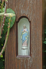 Foto rechts: Nische mit Marien-Figur im Stamm des Kreuzes