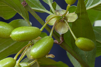 Steinfrüchte, bis 20 mm lang und etwa 5 mm dick, oval, glänzend, enthalten eine langen Steinkern; bei Reife leuchtend rot.