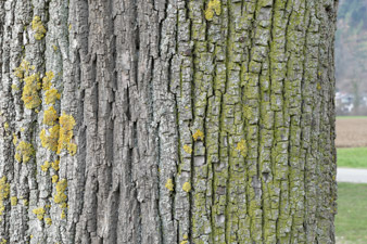 Der Stamm besitzt in der Jugend eine glatte Rinde, die im Alter grob längsrissig wird und dunkelbraun-schwärzlich wirkt.