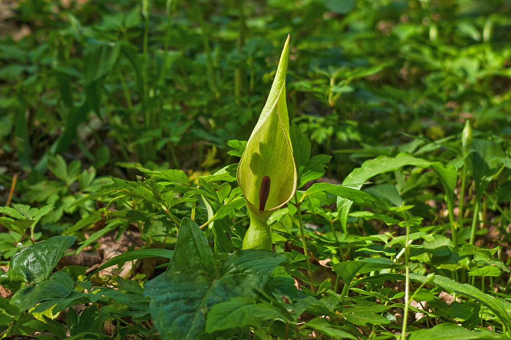 Blütenstand eines Gefleckten Aronstabs (Arum maculatum), Begleitpflanzen: Bärlauch, Buschwindröschen