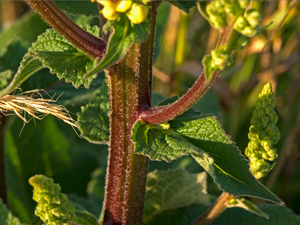 Laubblätter am Stängel, rechts durchschienen von der Abendsonne