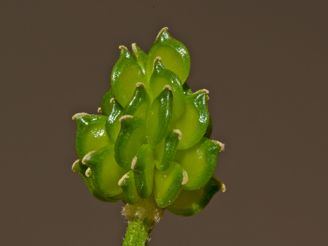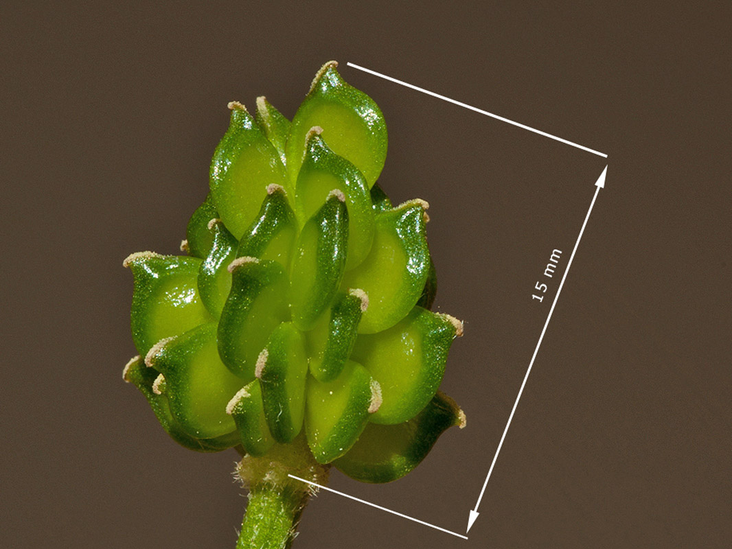 Foto rechts: Fruchtstand, Durchmesser 10 mm, Höhe 15 mm.