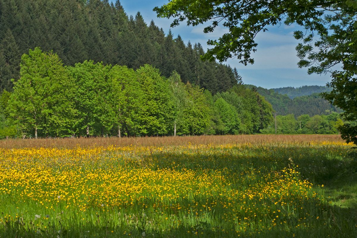 Scharfer Hahnenfuß – Ranunculus acris, der das Bild einer Wiese prägt; Freiburg-Ebnet, Gewann Harsch, nördlich des Eschbach.