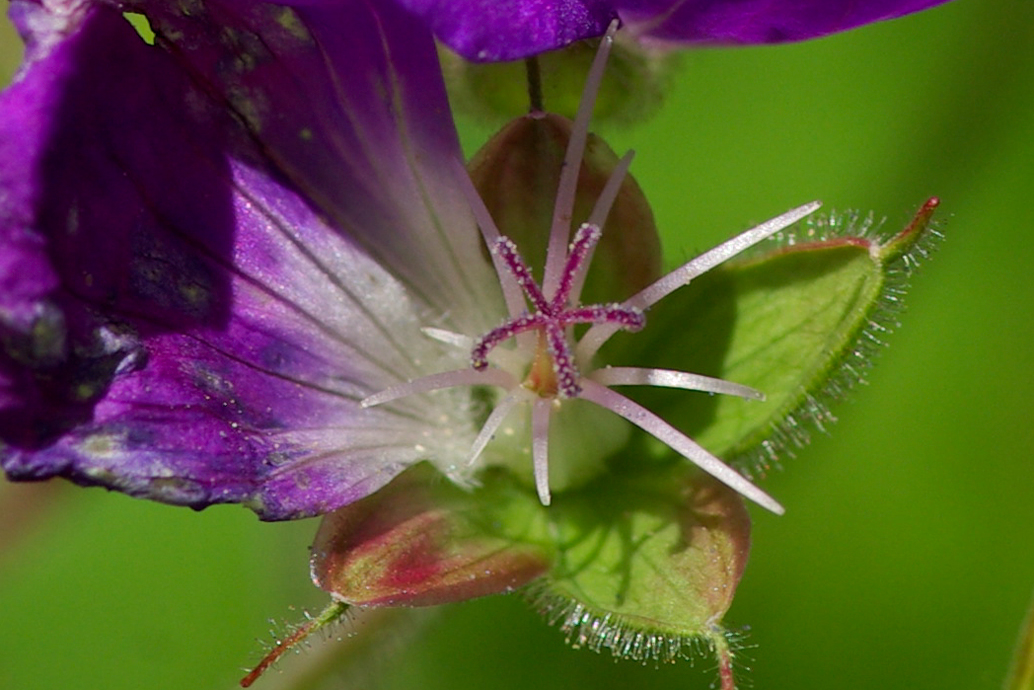 Wald-Storchschnabel (Geránium sylváticum): Blüte mit leeren Staubfäden, entfalteter Narbe und teilweise abgefallenen Blütenblättern