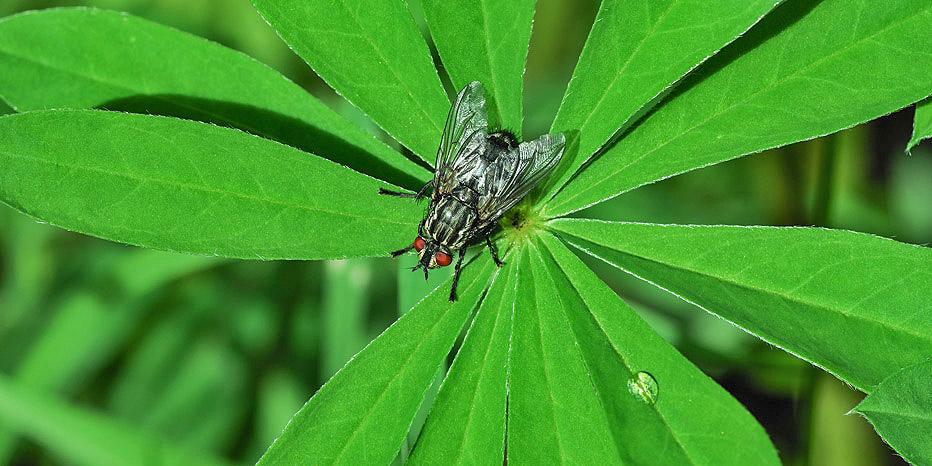 Weibliches Graue Fleischfliege – Sarcophaga carnaria auf dem Laubblatt einer Vielblättrigen Lupine
