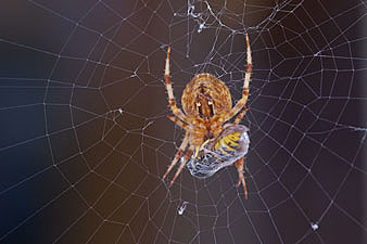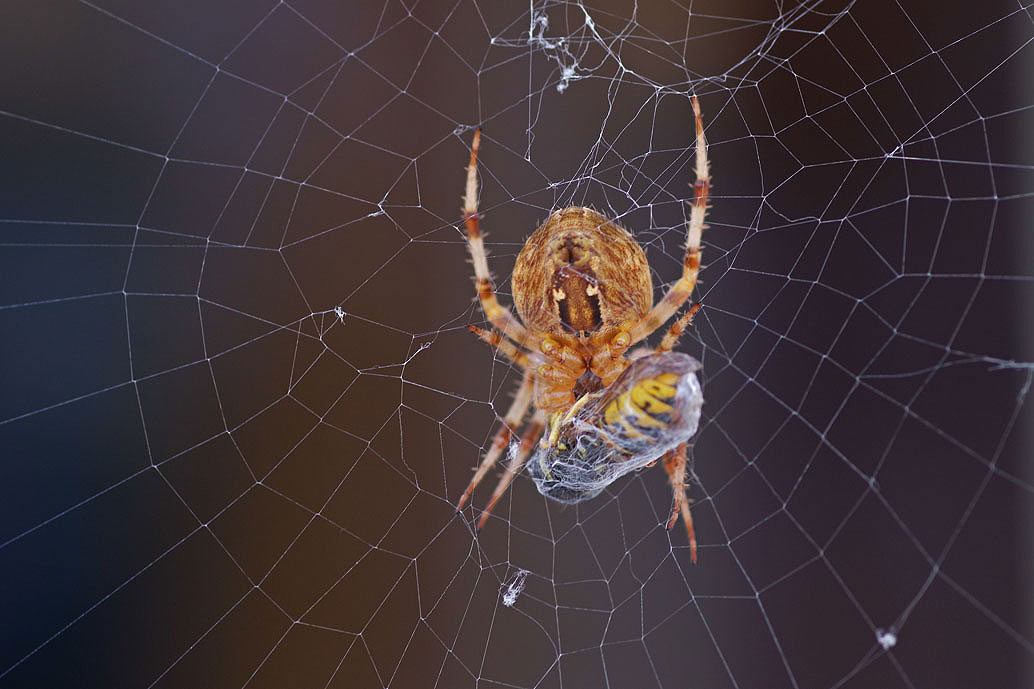 Lebensraum: Die Spinne baut senkrechte Radnetze mit trapezförmigem Rahmen und kreisförmigen Fangfäden zwischen Bäumen, Sträuchern, Zäunen und Gebäudeteilen. Sie lauert in der Netzmitte Kopfüber auf Beute.
