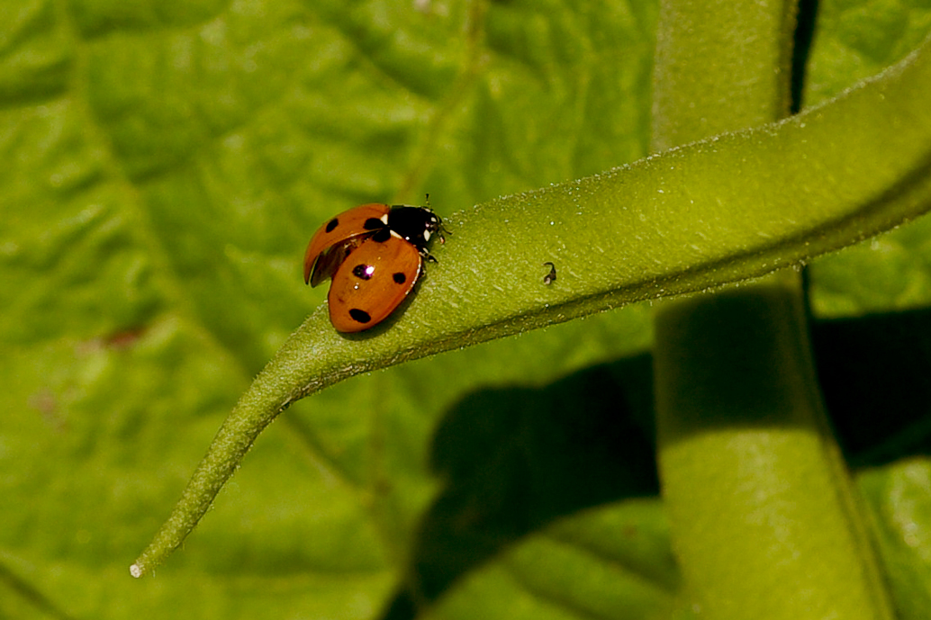 Siebenpunkt-Marienkäfer (Coccinella septempunctata) auf einer Bohne.