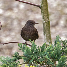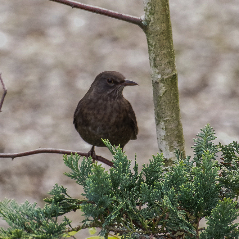 Amsel-Weibchen: dunkelbraun; Schnabel braun.