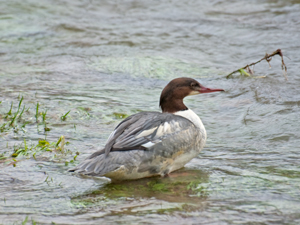 Gänsesäger-Paar (Mergus merganser) in der Dreisam, Höhe Berthold-Gymnasium, Freiburg-Waldsee