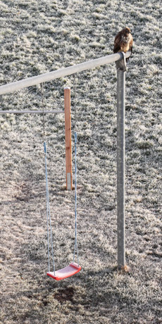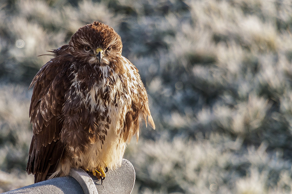 Der Mäusebussard sitzt auf einem Schaukelgerüst, aufgeplustert gegen die winterliche Kälte. Zu erkennen sind die gelben Fänge sowie der Unterflügel mit hellem Fleck.