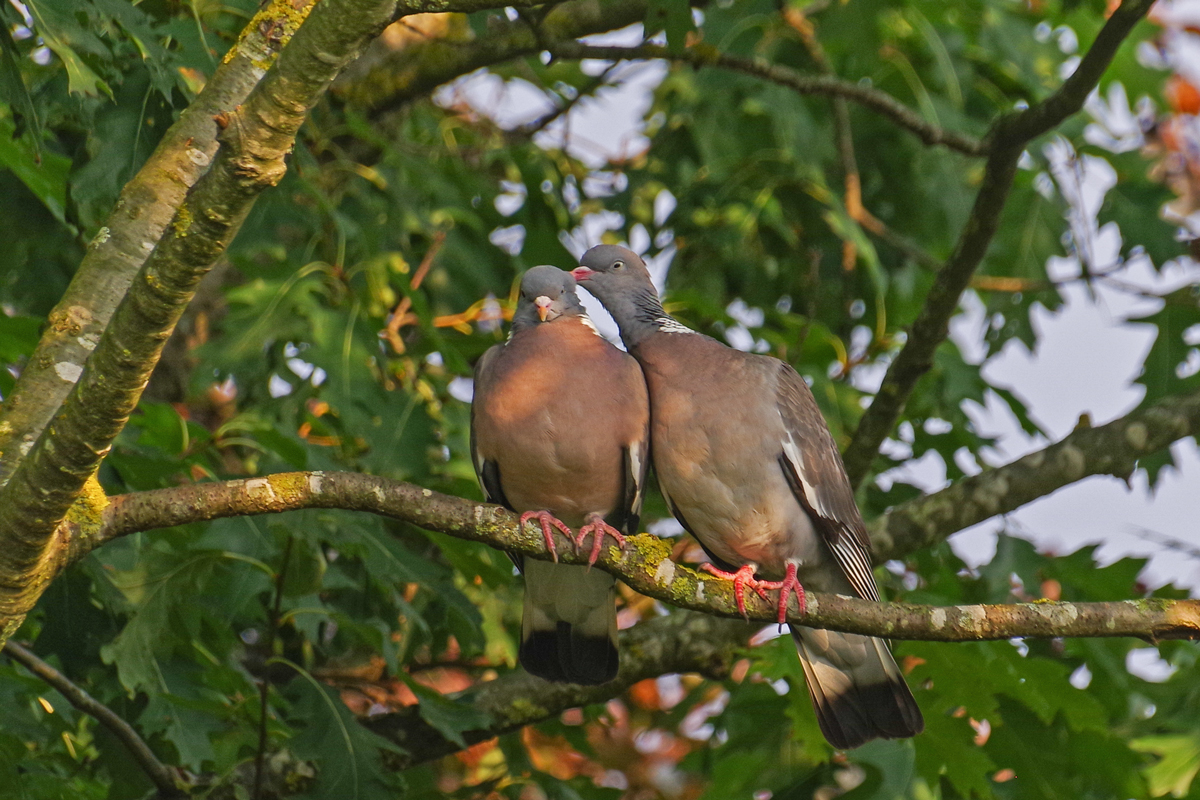 Turtelendes Ringeltaubenpaar (Columba palumbus) auf einer Roteiche (Quercus rubra)