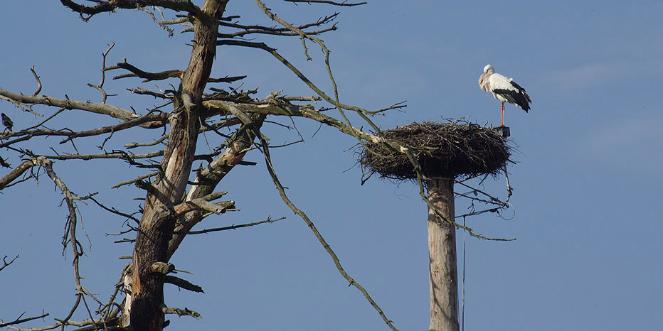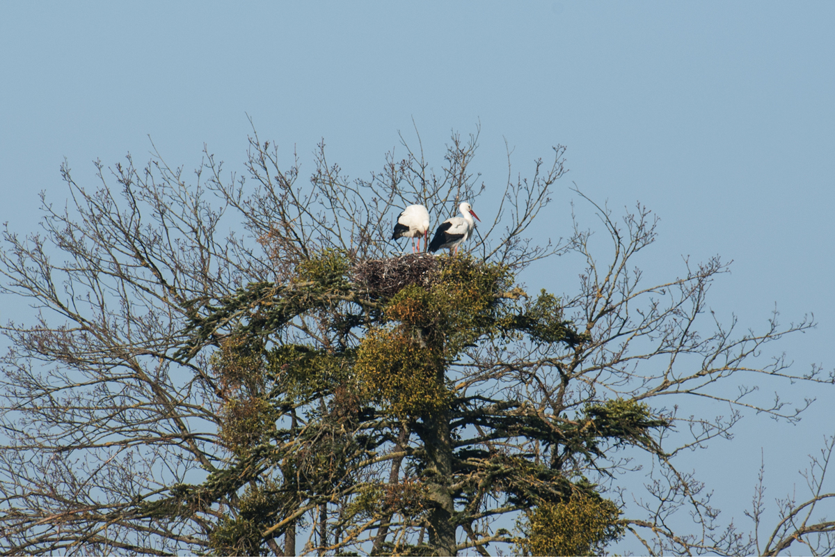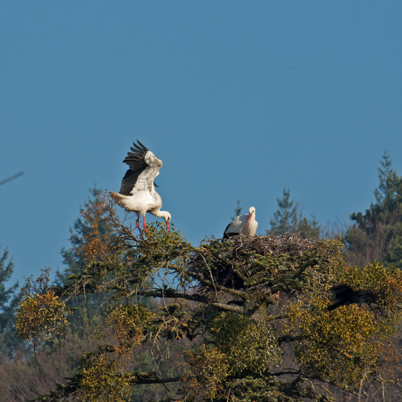 Nest hoch auf Bäumen, Dachfirsten, Nestmaterial: Zweige, Äste. Auf dem Nest lautes Schnabelklappern.