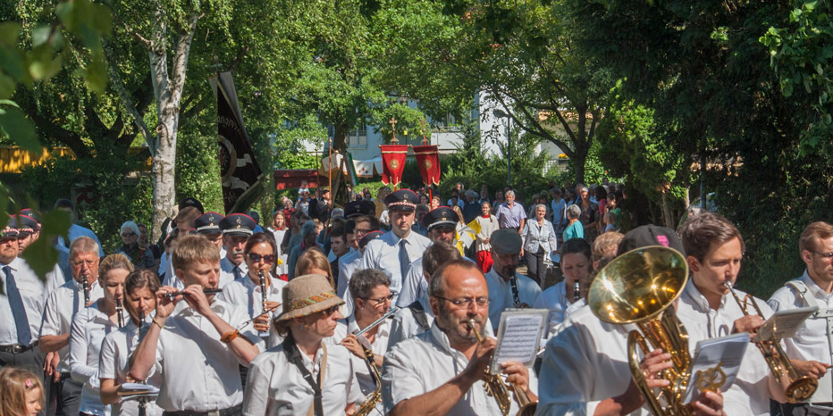 Das Fronleichnamsfest im Ebnet, am Donnerstag, den 4. Juni 2015, begann mit dem Open-Air-Gottesdienst am Feuerwehrhaus. Der Prozessionsweg führte anschließend über die Bruggastraße – Hornbühlstraße (Richtung Schwarzwaldstraße) – Zartner Straße – Bruggastraße über die Schwarzwaldstraße zur Steinhalde. Die Anwohner waren gebeten den Prozessionsweg zu schmücken.